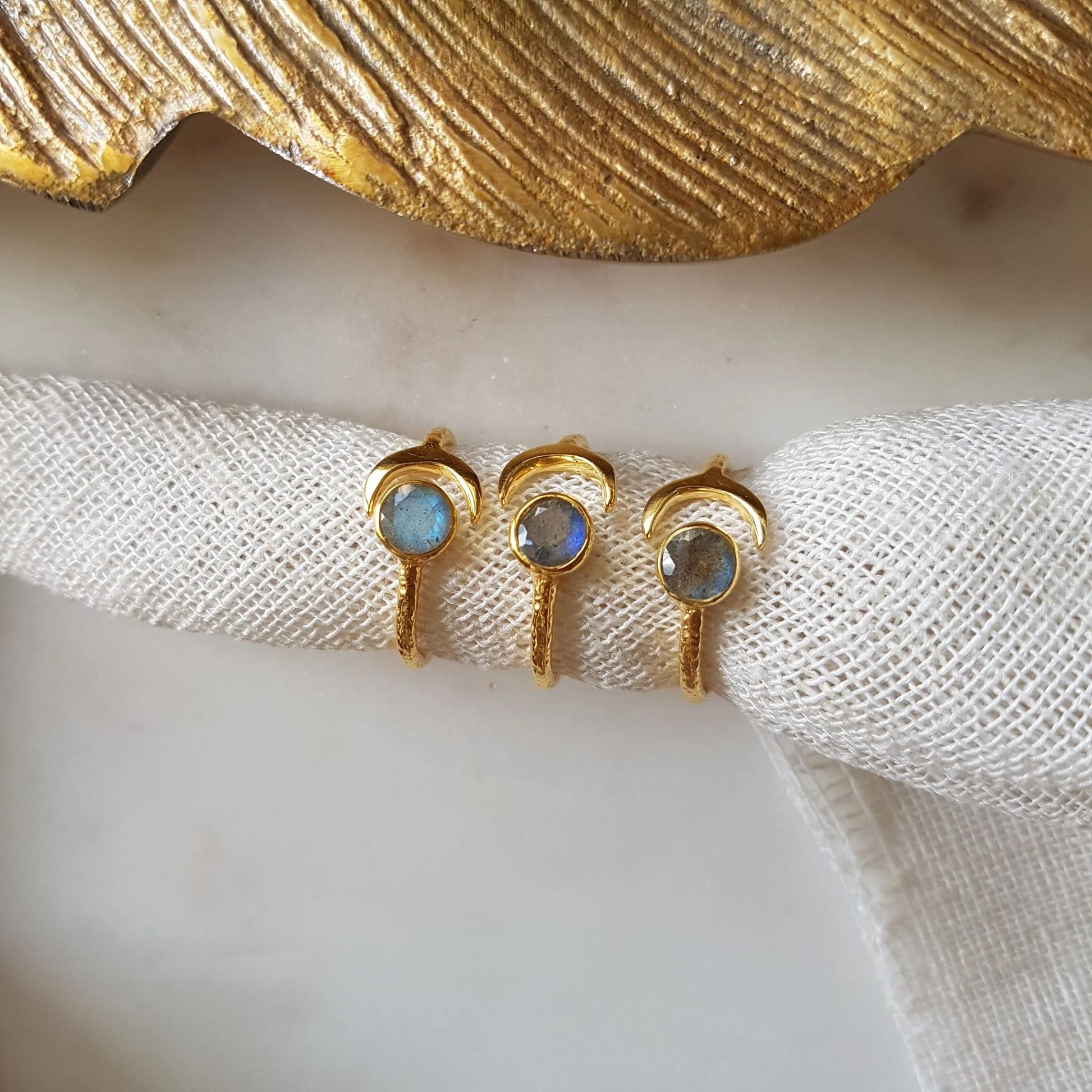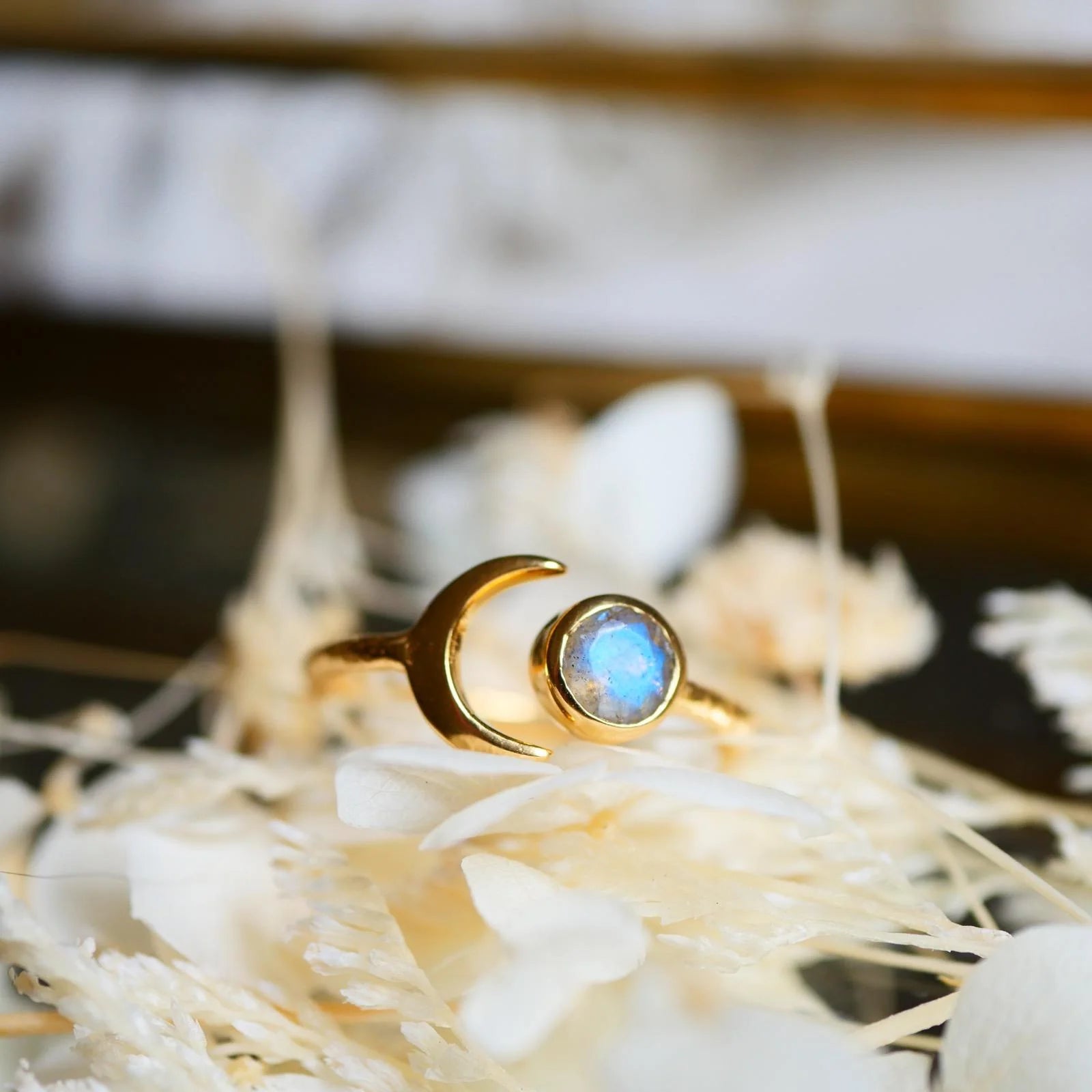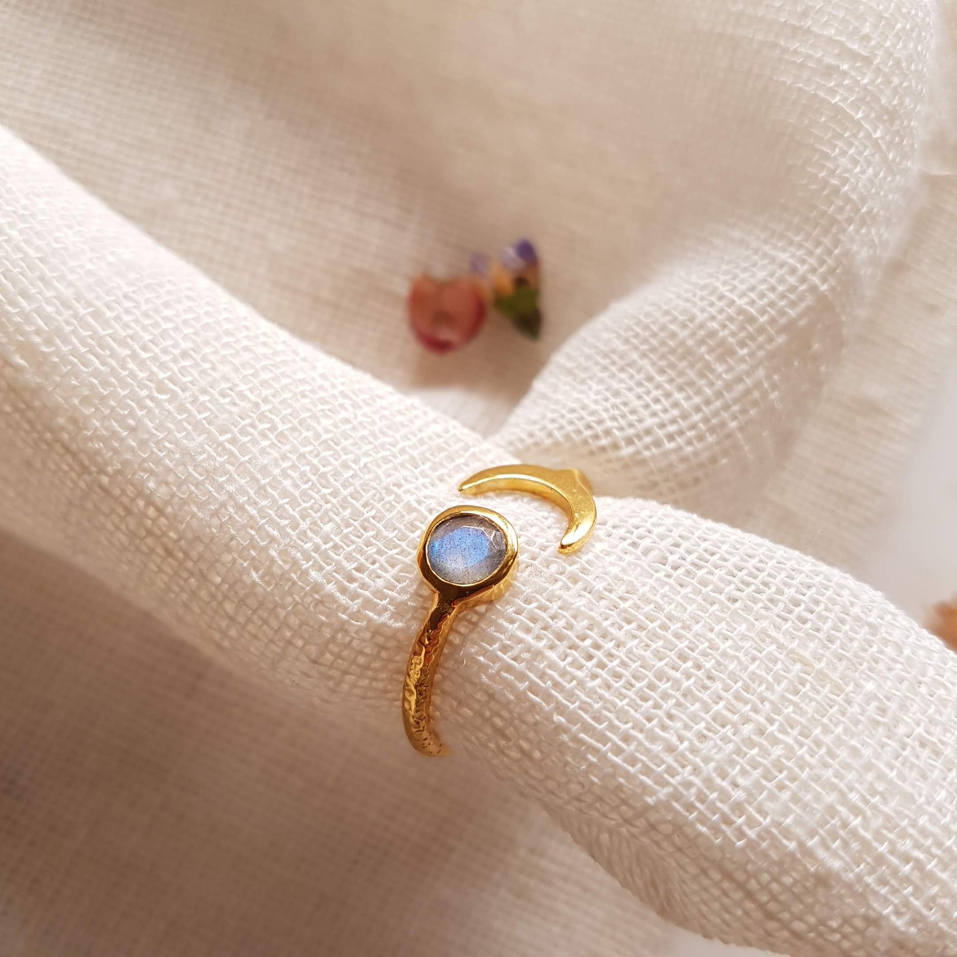 This labradorite Moon ring is for the woman who has made peace with her darker phases. The moon doesn't always shine full—sometimes it disappears completely, and it's in this darkness that it regenerates. Labradorite flashes with hidden colors, reminding you that even in your darkest nights, there is magic brewing. Wearing this Moon ring is accepting that you are allowed to disappear sometimes, to withdraw, to regenerate in the shadows. You are the moon—mysterious, cyclical, magnetic. And that's perfect.