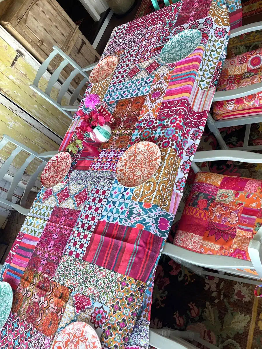 East meets west in this stunning patchwork of patterns. A fragment of Japanese silk obi, an Uzbek ikat, floor tiles from a thousand-year-old church, a scrap of hand-woven Turkish kelim. Like a magpie, Anna scours out-of-the-way flea-markets and medinas for pieces of the past from which to create something new yet timeless.