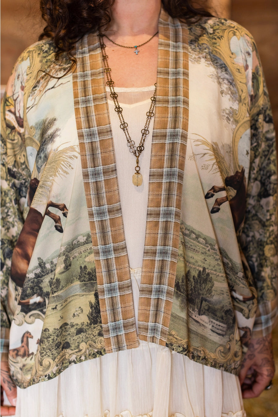 Born to Run blends vintage-washed, heritage prints with two rearing racehorses by British painter George Stubbs. The antique banners, etched with mottos of rebellion like “Don’t Fence Me In”, are our spirited nod to the wild west and the open road. The beautiful, airy backdrop behind the horses is a scenic lithograph from the 1897 World’s Fair & the faded florals and golden wheat were taken from an 1800’s farmers diploma. The pen-and-ink stars and upturned horseshoe are also antique drawings from the same era. And as a final, playful touch, we added a prancing mother horse and foal — a symbol of unbound freedom and joy. The whole design is trimmed in a washed heritage plaid.