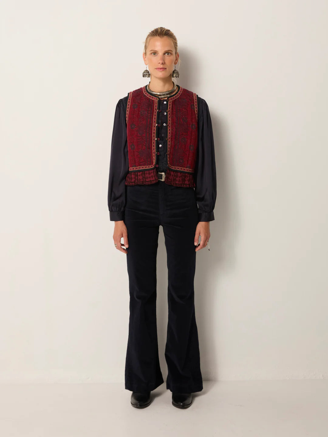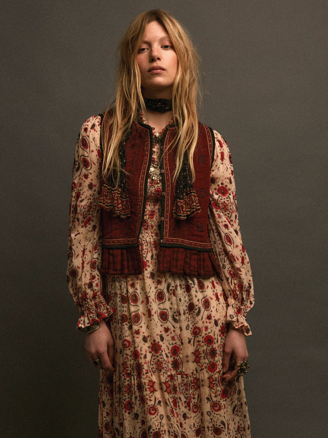 The vest is finished with embroidery tracing the piping and ruffles at the hem in a contrasting shade. These details highlight its artisanal character while keeping the silhouette easy to wear.