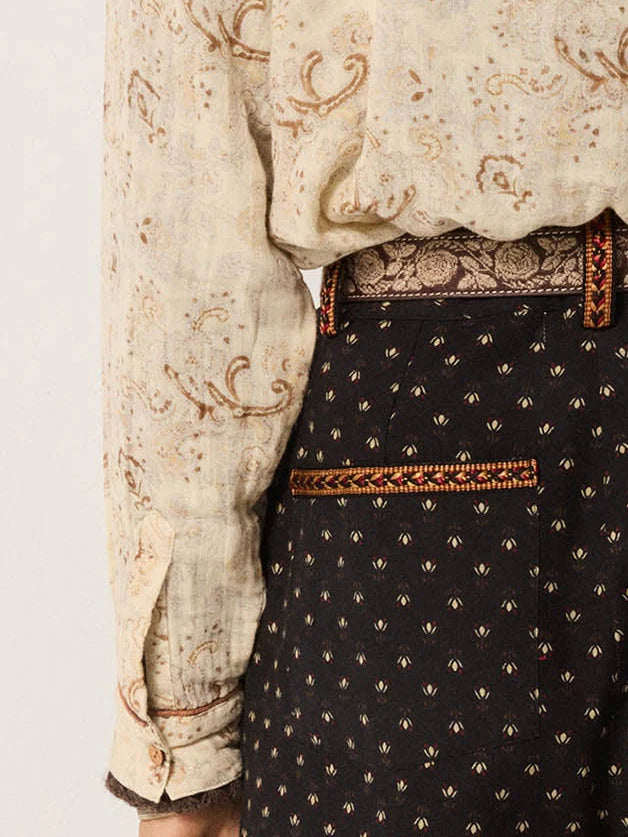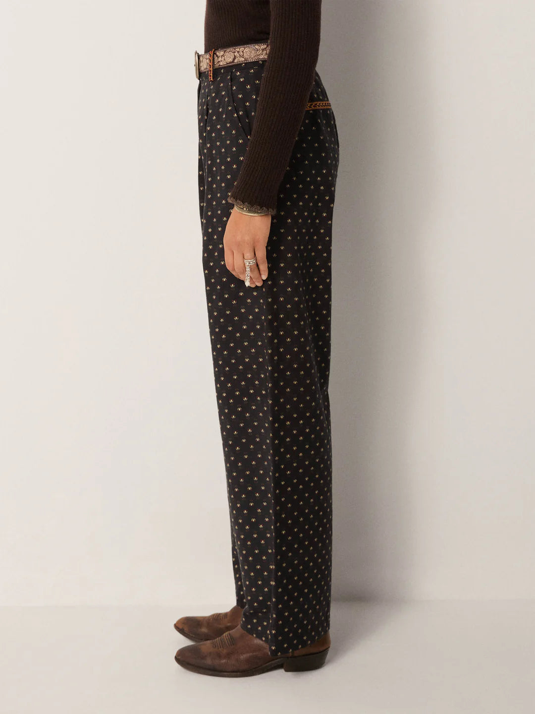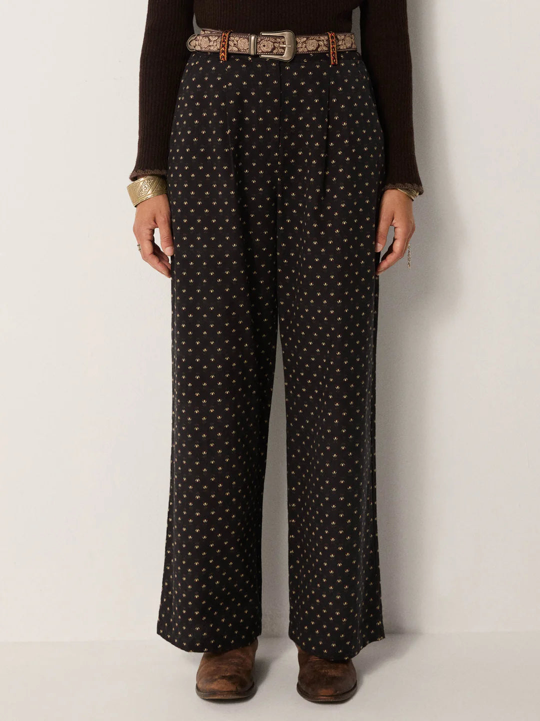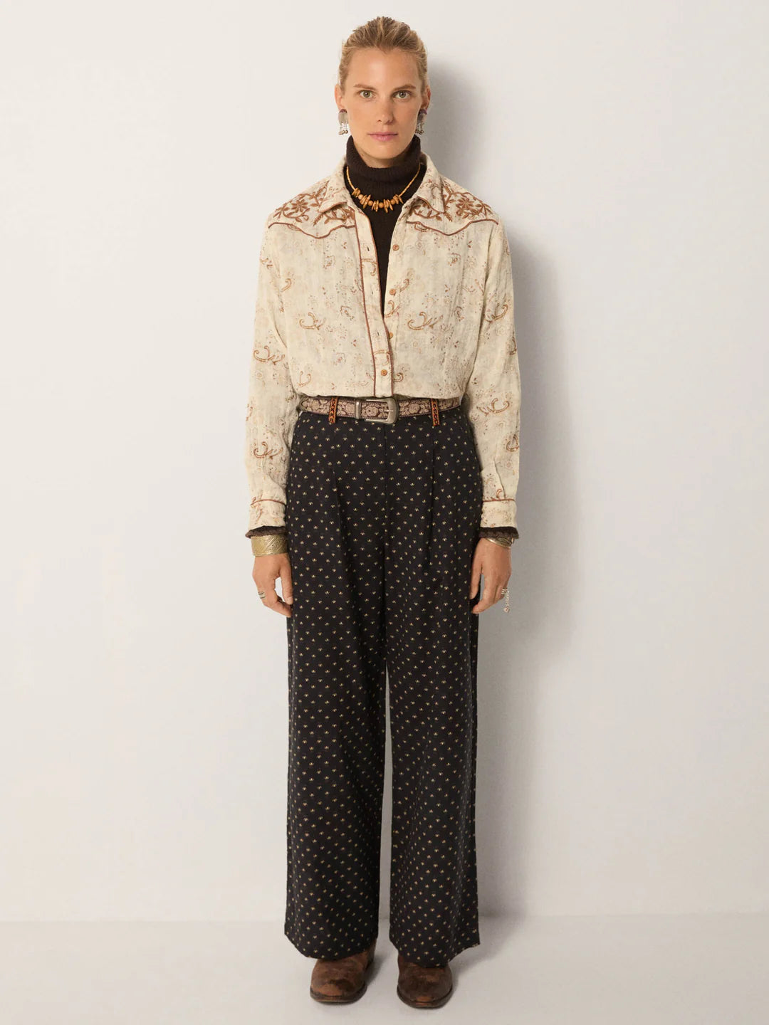 The deep black base is enriched with golden block–print motifs, subtle and artisanal. A relaxed high rise and pleated front complete the silhouette with understated ease.