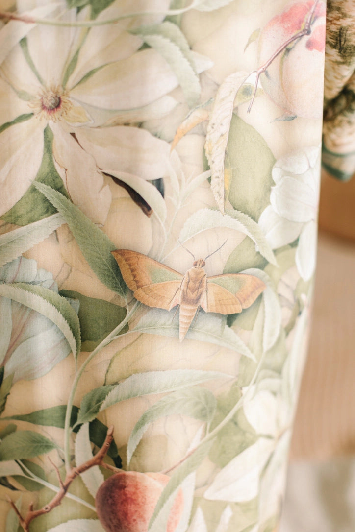 Revel in the warmth of Fleur de Soleil, our ode to golden hours when the sun lingers and the world slows to a dreamy hush. Inspired by antique beauty — 1891 watercolour and graphite studies of magnolia blossoms for Tiffany & Co., Victorian lithographs of ripe peaches, and a whimsical 1830 sketch of a fountain and garden pavilion. Trimmed with butterflies and moths from an early 19th-century insect encyclopedias. Rendered in soft washes of peach, coral, sage, and sun-warmed tan, it feels like the memory of a perfect day. Includes removable belt.