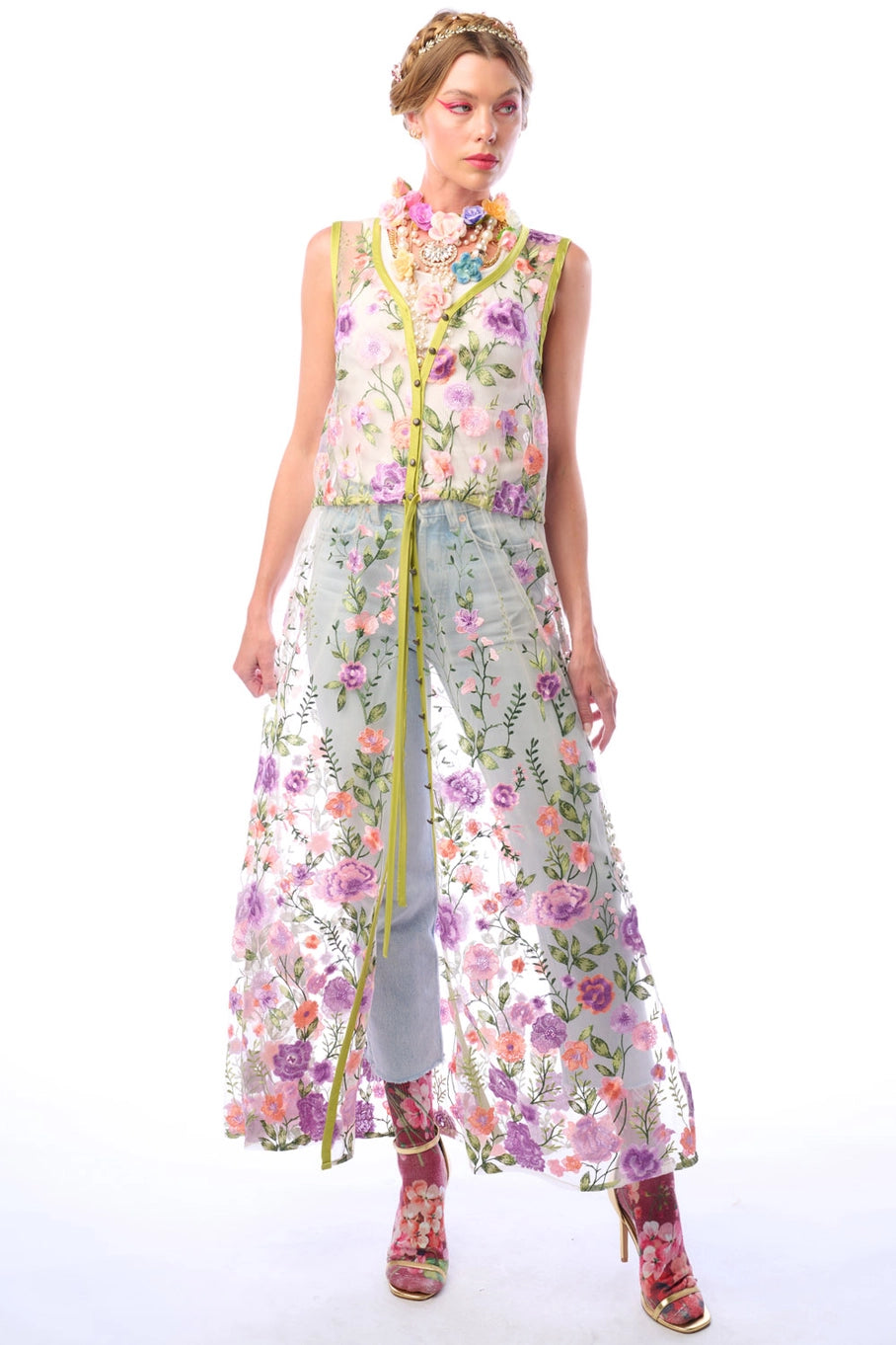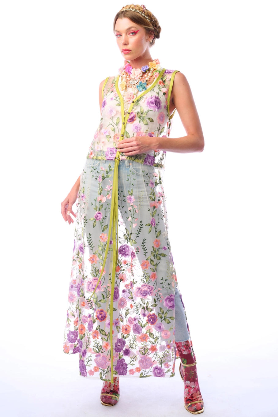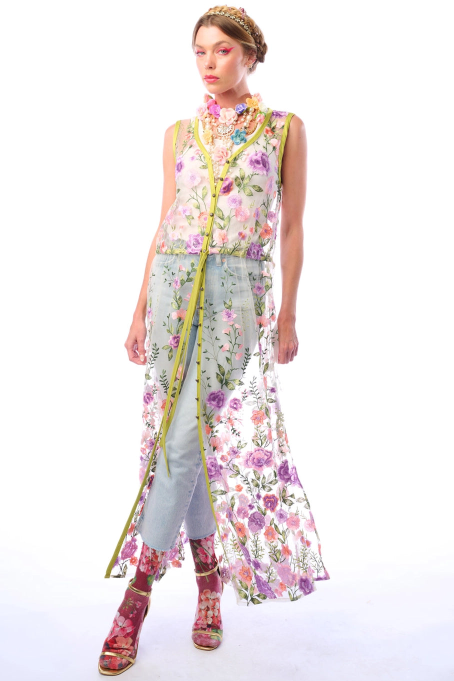 A lightweight, embroidered mesh duster featuring a soft lavender floral design. This button-down style includes a drawstring waist for adjustable shaping, offering versatility for layering over dresses, denim, or basics. Crafted from sheer mesh with detailed floral embroidery, it provides an elegant, airy finish without adding bulk.