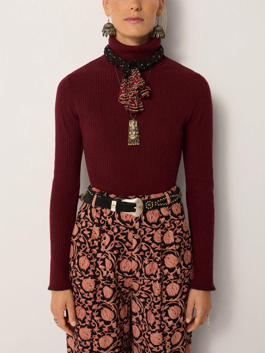 Cotty Dobby with a faint glisten. Delicate scarlet florals unfold across the dark surface.
