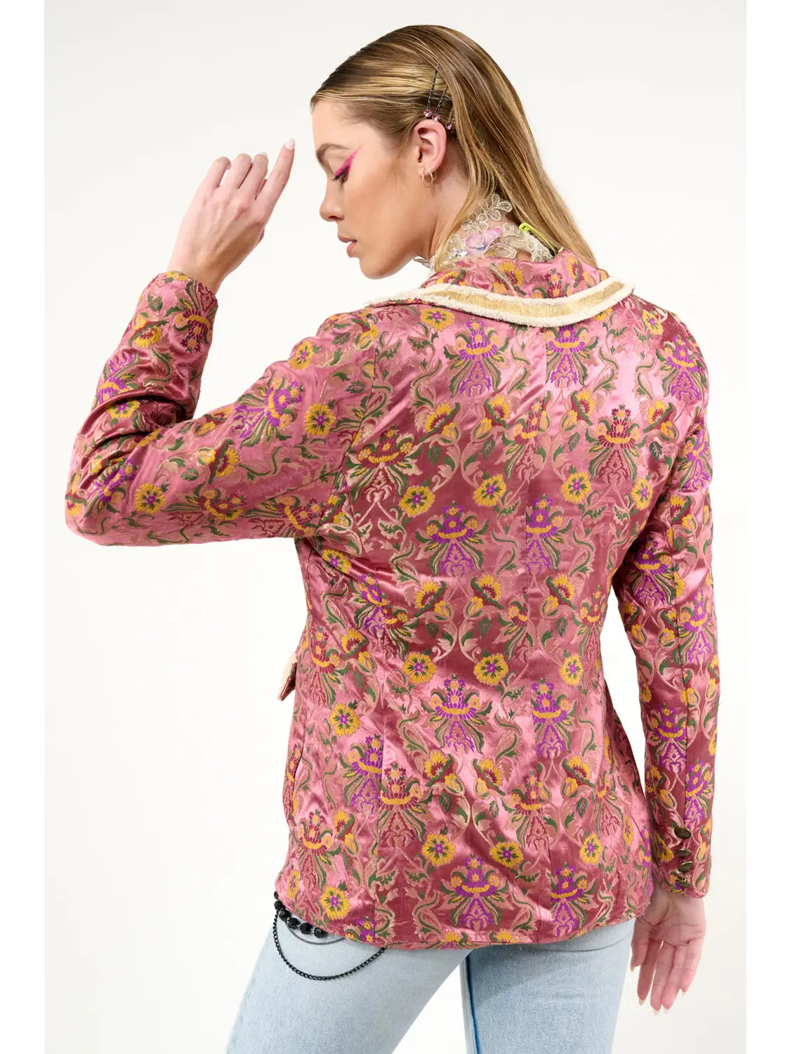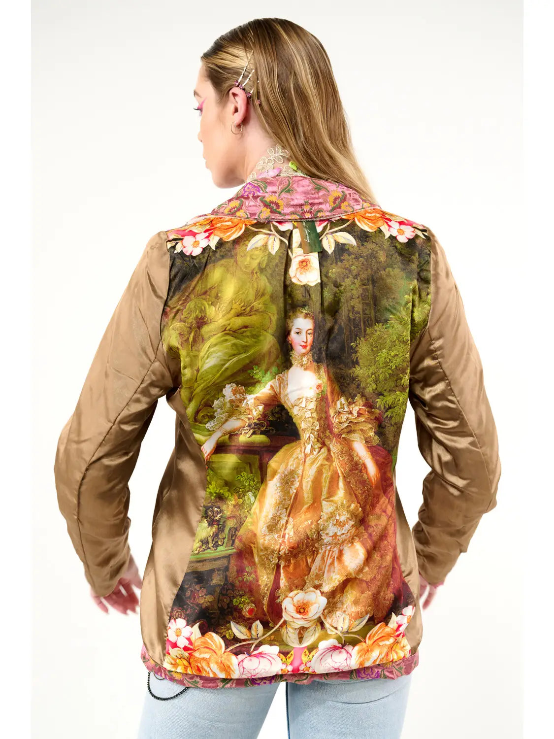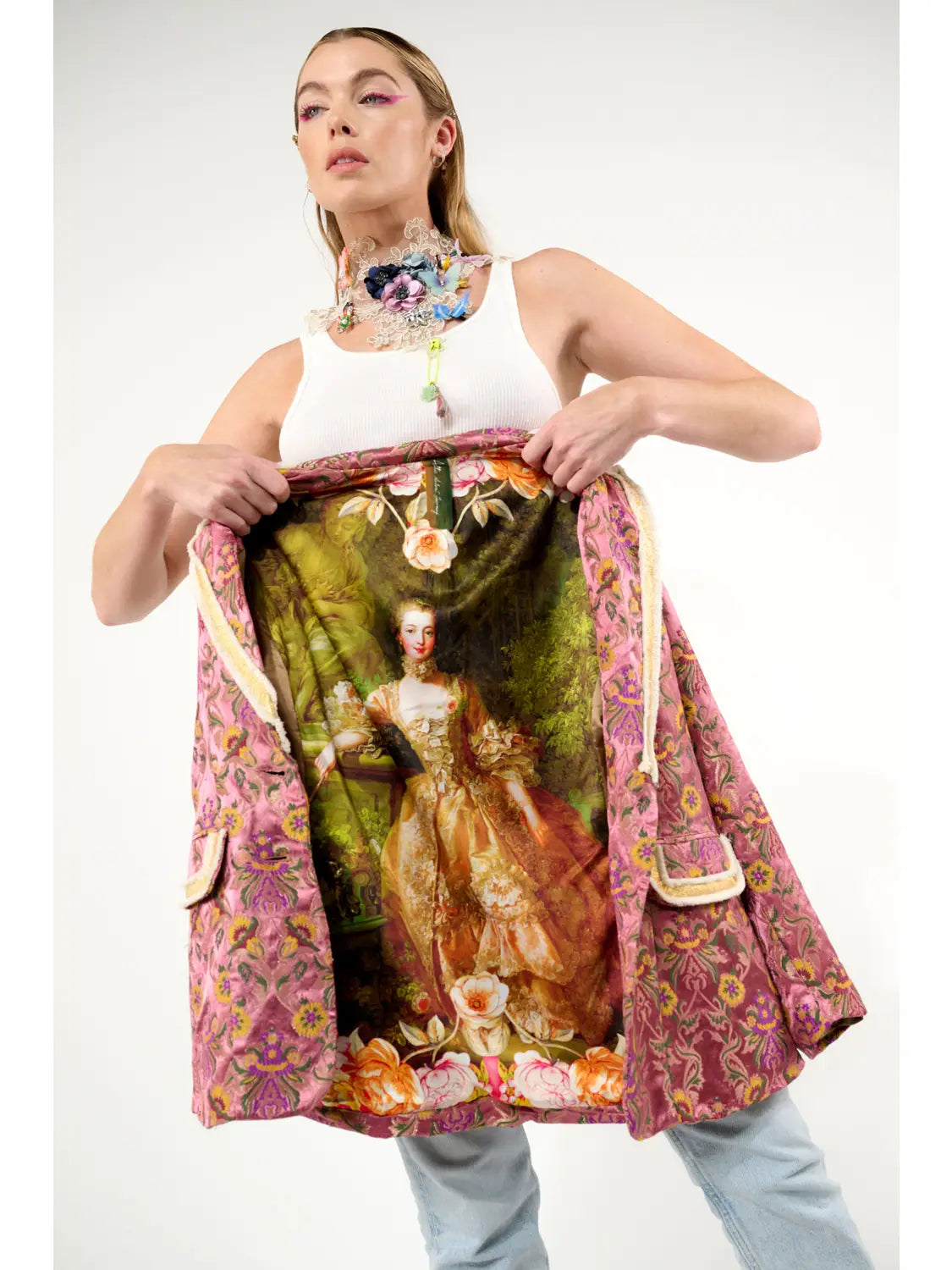 A blazer with a secret. On the outside: a pinkish-mauve floral jacquard, finished with metallic gold trim for a touch of polish. Open it up and you’ll reveal the pièce de résistance: a satin lining printed with François Boucher’s portrait of Madame de Pompadour — art history, but make it wearable.