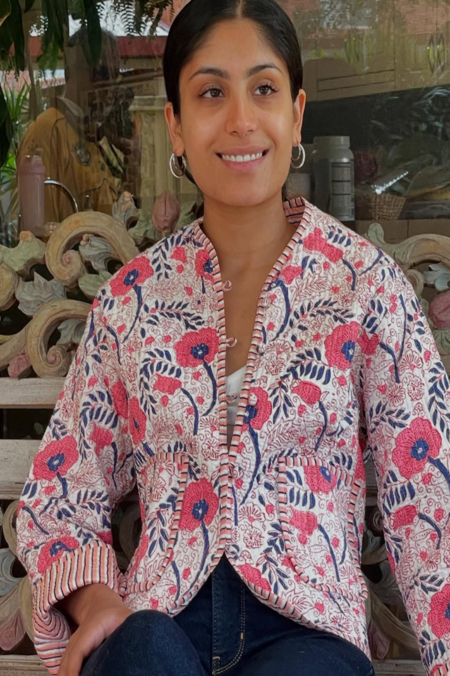 Expertly crafted from 100% cotton by skilled artisans, this lightweight quilted jacket offers both comfort and versatility. With its reversible design, you can switch between two equally elegant looks, making it a perfect transitional piece for any season. Whether styled casually with denim or layered over a dress for a sophisticated touch, this piece brings timeless elegance to your wardrobe.