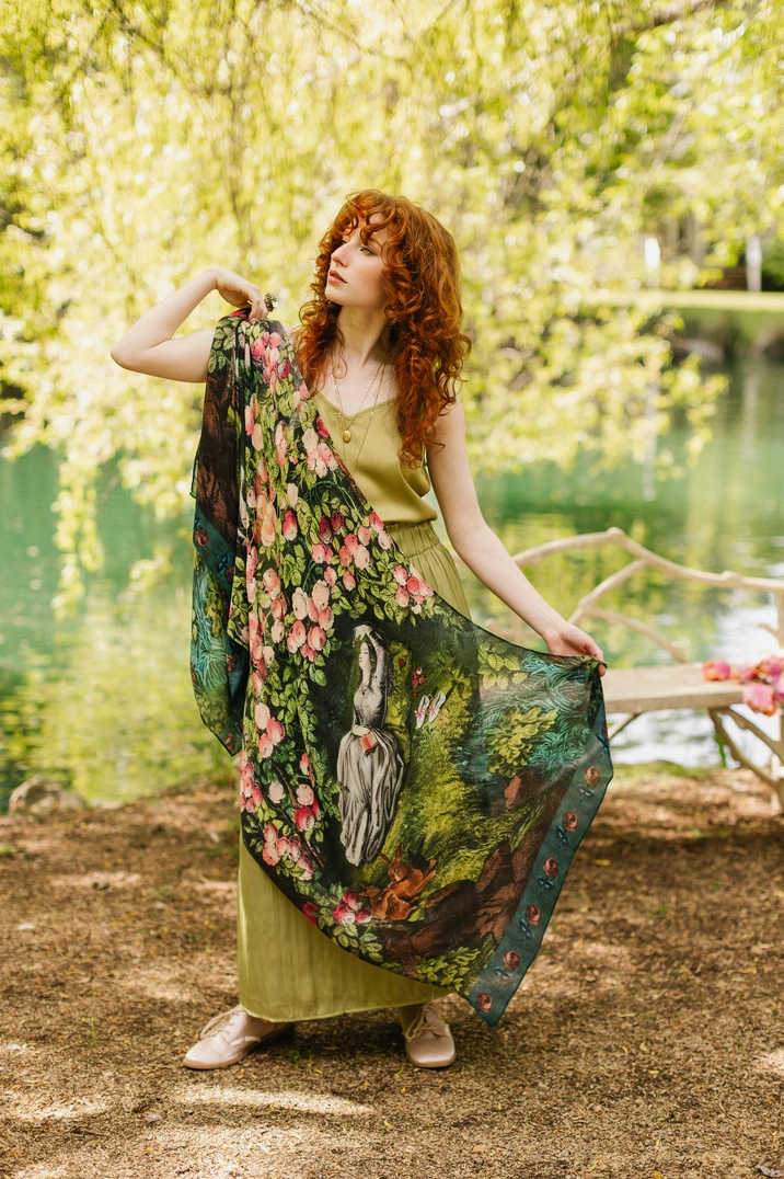 Born from our love of romance and whimsy, The Daydreamer is a print that feels as though it wandered out of a fairytale. Created using a hand-coloured etching from the 1880s called The Bower of Roses, it depicts a woman who has drifted into sleep where roses climb and spill overhead. An open book of poetry rests with her. Around her, the world softens—ribbons flutter from a pair of delicate ballet slippers, and a charming family of rabbits from an antique lithograph watch over her slumber. The trim is edged with painted roses circa 1800 adding a whisper of old-world charm. Rendered in lush tones of chartreuse and deep teal, with bright pink roses scattered like dreams.