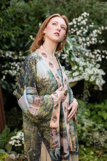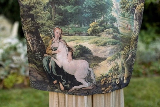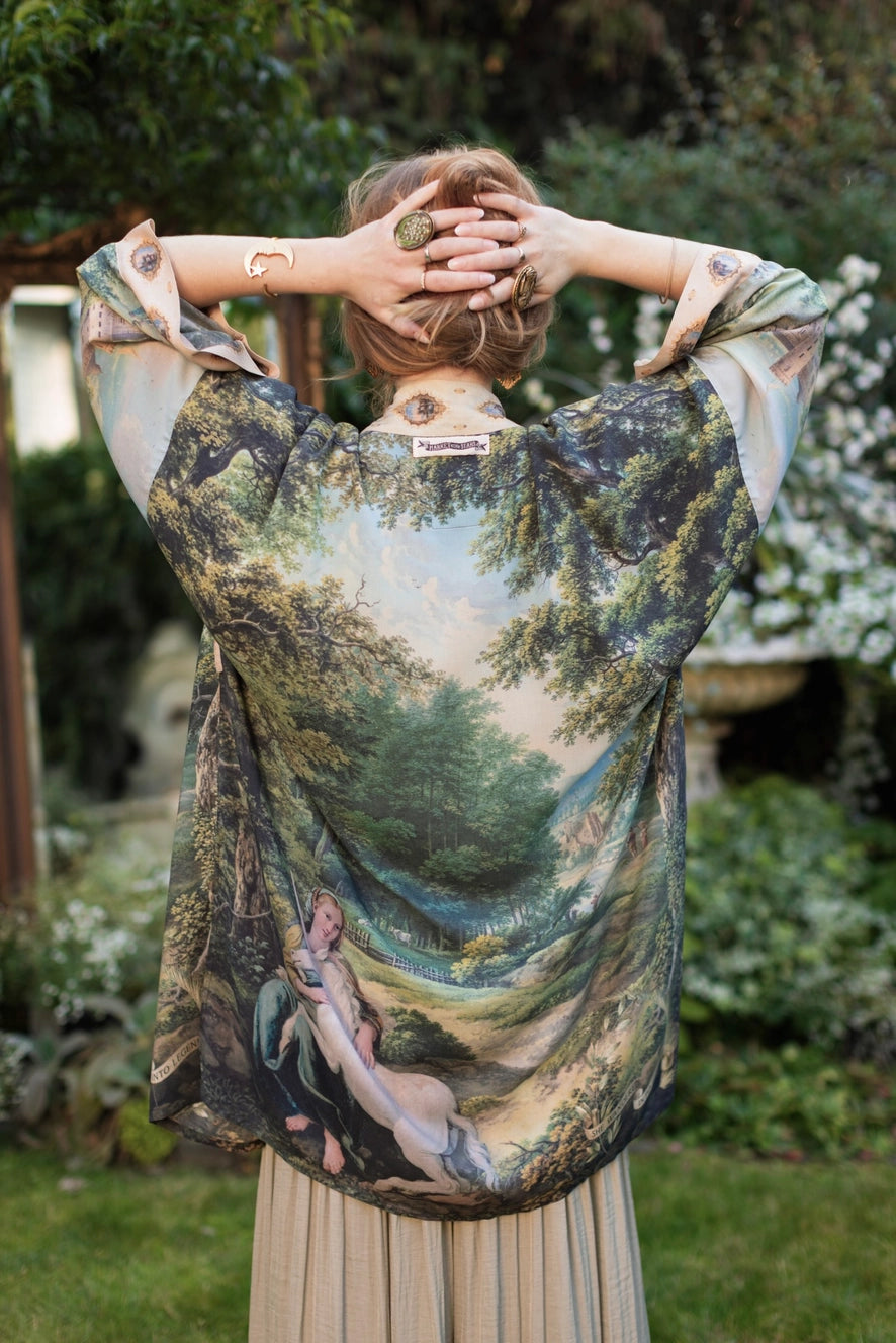 The Mythmaker is an invitation—to believe in the unseen, to walk with wonder, and to dwell in possibility! Inspired by our childhood love of the legends of King Arthur and the ancient lore of unicorns, this print is a tapestry of imagery pulled from across the centuries, stitched together with a reverence for myth, memory, and the quiet power of imagination. At its heart is a fresco from the early 1600s, where a barefoot woman cradles a unicorn—a creature long associated with intuition, purity of heart, and the magic that lives just beyond the veil. She rests amid two sweeping 18th-century pastoral landscapes, where wild woods spill into golden meadows, and in the distance rises Ericstan, the lost castle of Tarrytown, rendered in an 1855 watercolour. (Though it once stood in the hills of New York, little trace of it remains—except, perhaps, in dreams.) As a final, poetic touch, we added a laurel, palm, and juniper wreath—painted by Leonardo da Vinci— inscribed with the words: She wandered into legend. Rendered in faded tones of moss green, soft blue, and weathered gold, the palette feels timeworn, as though the piece itself has been passed down through centuries of telling and retelling. Like the women of Arthurian lore—those who shaped destiny with wisdom, will, and wonder—The Mythmaker honours the bold act of choosing possibility. It is a garment of story, a whisper of legend, and a reminder that sometimes, the most powerful path is the one we dare to imagine.